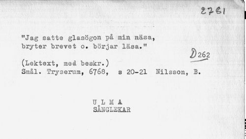 //// j //// - . . __ . . .... . n //// "Jag satte glasögon på min näsa, //// bryter brevet o. börjar läsa." //// /)262 //// (Lektexty med beskr.) //// Smål. Tryserum, 6768, s 20-21 Nilsson, B. //// U L n A //// SÅNGLEKAR ////