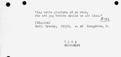 //// "Jag satte glasögon på mi näsa, //// för att jag bättre skulle se att läsa." //// ^262 //// (Sånglek) //// Smål. Ryssby, 21132, s. 46 Haeggblom, C. //// U L M A //// SÅNGLEKAR //// ) //// j * //// i . //// t //// i ////