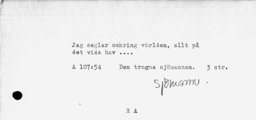 //// k;. //// Jag seglar omkring världen, allt på //// det vida hav .... //// A 107:54 Den trogna sjömannen. 3 str. //// R A ////