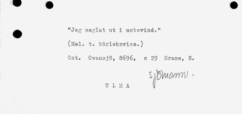 //// ^^ "Jag seglat ut i motevinå." //// (Hel. t. kårleksvisa.) //// Gst. Ovansjö, 8696, s 2$ Grane, B. //// U L M A ( //// t ////