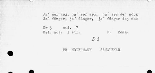 //// Ja ' ser dej, ja ' ser dej, ja' ser dej nock //// Ja' fångar, ja' fångar, ja' fångar dej ock //// Nr 3 sid. 7 //// Hel. not. 1 str. D. komm. //// ^ PR NODERHANN SÅNGLEKAR ////