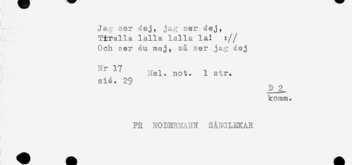 //// Jag ser dej, jag ser dej, //// Tiralla lalla lalla la! :// //// Och ser du mej, så, ser jag dej //// Nr 17 //// Mel. not. 1 str. //// sid. 29 //// D 2_ //// komm. //// PR NODERmNN SÅNGLEKAR ////