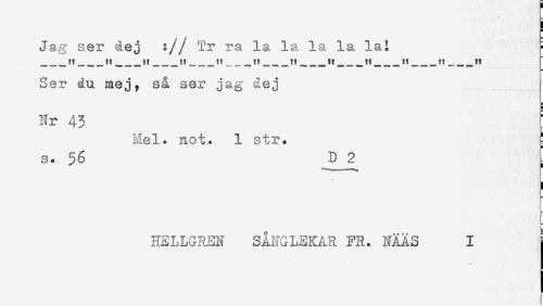 //// Jag ser dej :// Tr ra la la la la la! - //// ____!! ____t!___tt___!!___!t______. tt___!t___!!___H___t!___H___t! //// Ser du mej, så ser jag dej //// Nr 43 //// Mel. not. 1 str. ! //// s. 56 ^D 2 //// ! //// HELLGREN SÅNGLEKAR FR. NÄAS I ////
