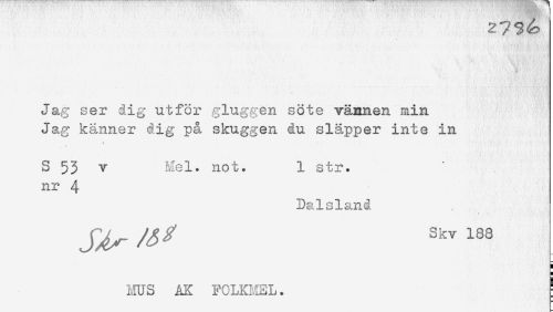 //// Jag ser dig utför gluggen söte vännen min //// Jag känner dig på skuggen du släpper inte in //// t //// S 53 v Mel. not. 1 str. //// nr 4 //// Dalsland //// J^y- Skv 188 //// i //// HUS AK B^OLKHEL. ; ////