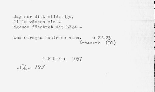 //// H //// Jag ser ditt milda oga, //// lilla vännen min - //// igenom fönstret det höga - ! //// 5 //// Den otrogna hustruns visa. s 22-23 //// Ärtemark (Dl) //// ) //// I F G H : 1057 //// J^- i //// i- //// ) //// i ////