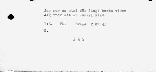 //// Jag ser en stad där långt borta viken //// Jag tror det är Jamari stad. //// 1:6. VÅ. Brage 2 nr 41 //// N. //// ÅBO //// ! //// ! ////