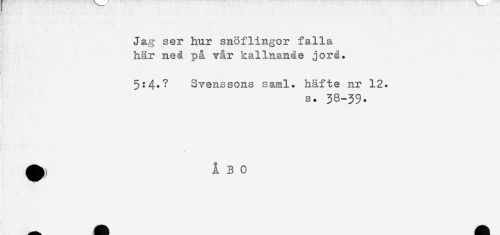//// Jag ser hur snöflingor falla //// här ned på vår kallnande jord. //// 5:4.? Svenssons saml. häfte nr 12. //// s. 38-39- ////