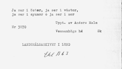 //// Ja ser i öster, ja ser i västor, //// ja ser i synnor o ja ser i nor //// Uppt. av Ånéers Malm //// Nr 3070 //// Vemmenhögs hå Sk //// LANDSHÅLSÄRKIVET I LUI^D ////