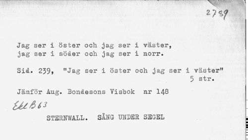 //// Jag ser i öster och jag ser i v§,ster, //// jag ser i söder och jag ser i norr. //// Sid. 239y "Jag ser i öster och jag ser i väster" //// 5 str. //// Jämför Aug. Bondesons Visbok nr 148 //// STERNWALL. SÅNG UNDER SEGEL . ////