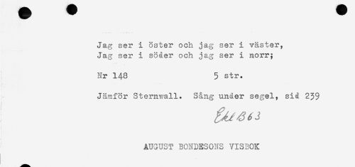 //// — — V- S i — J -. //// Jag ser i öster och jag ser i väster, //// Jag ser i söder och jag ser i norr; //// Nr 148 5 str. //// Jämför Sternwall. Sång under segel, sid 239 //// / //// AUGUST BONDESONS VISBOK ////