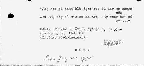 //// "Jag ser på dina blå ögon att du har en annan //// ^ kär //// ^^ Ack säg mig då min hulda vän, säg hwem det då //// &3T * * * ^ //// Sdml. Dunker o. Ärila,347^45 c, s 351- //// Ericsson, G. (bd 16). //// (Enstaka kärleksvisor). //// U L M A ////