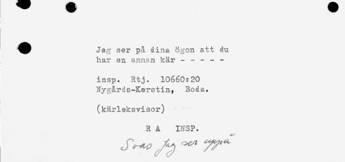 //// i //// Jag ser på dina ögon att du //// har en annan kär - - - - - //// insp. Rtj. 10660:20 //// Nygårds-Kerstin, Boda. //// (kärleksvisor) //// R Å IMSP. ////