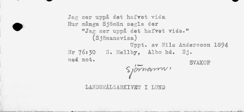 //// Jag ser uppå det hafvet vida //// Hur många Sjömän segla der //// ^^ "Jag ser uppå det hafvet vida." //// (Sjömansvisa) //// Uppt. av Nils Andersson 18$4 //// Nr 76:30 3. Nellhy, Albo hå. Sj. //// j ^^ SVAXOP' //// LAIfDSMÅLSARKIVET I LUND ////