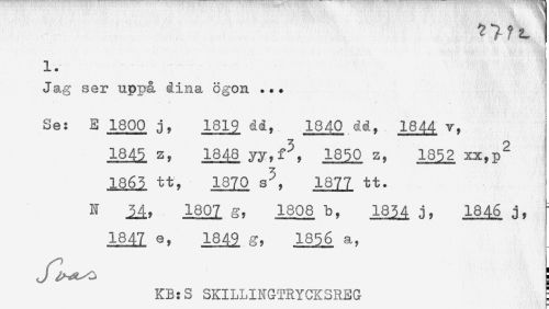 //// i. //// Jag ser uppå dina ögon ... //// Se: E1800 j, 1819 dd, 1840 1844 v. //// 1345 z, 1848 yy,f^, 1850 z, 1852 xx.p^ //// 1865 tt, 1870 s^, 187? tt. //// N 1807 g, 1808 b, 1834 .1. 1846 .i. ' //// 1847 e, 1849 g, 1856 a, //// f //// KB:SSKILLINGTRYCKSREG : ////