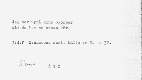 //// Jag ser uppå dina ögonpar //// att du har en annan kär, //// 3:4*? Svenssons saml. häfte nr 2. s 32. //// 1 //// [ //// ^ ÅBO ////