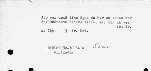 //// Jag ser uppå dina ögon åu har en annan kär //// Ack skönaste flicka lilla, säj mig då vem //// det år. //// nr 166. 3 str. Mel. //// DAHL 3 TRÖM-FORS L IN ^ ^^ //// ^^ Finländsk ////