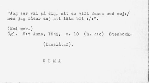//// "Jag ser väl på dig, att du vill dansa med mej:/ //// men jag råder dej att låta bli :/:". //// (Hed mek.) //// Ogl* Sst Anna, 1642, s. 10 (h. 4:0) Stenbock. //// i //// (Danslåtar). //// U L M A //// . .. ////