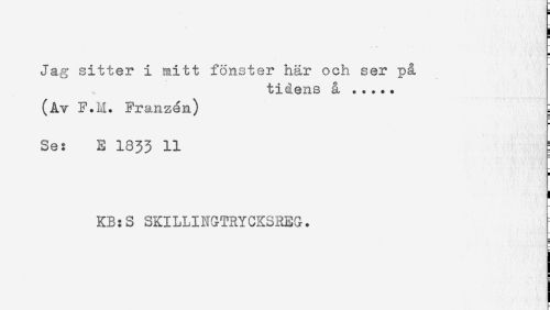 //// ] //// * //// i //// Jag sitter i mitt fönster här och ser på //// tidens å ..... //// (Av F.M. Franzén) //// * //// Se: E 1833 H //// < //// ! //// KB:S SKILLINGTRYCKSREG. //// 5 ////