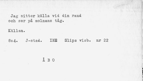 //// Jag sitter källa vid din rand //// och ser på molnens tåg. //// Källan. //// 8:4. J-stad. INE Slips visb. nr 22 //// ÅBO //// \ ////