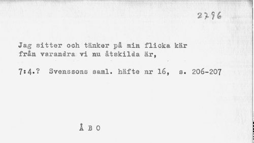 //// Jag sitter och tänker på min flicka kär //// från varandra vi nu åtskilda är, //// - — * . * //// 7:4.? Svenssons saml. häfte nr 16, s. 206-207 ////