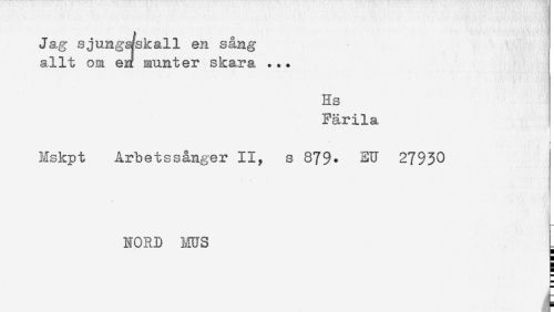 //// Jag sjungJskall en sång //// allt om en munter skara ... //// Hs //// Färila //// - //// - //// Mskpt Arbetssånger II, s 879. EU 27930 //// NORD ms - ////