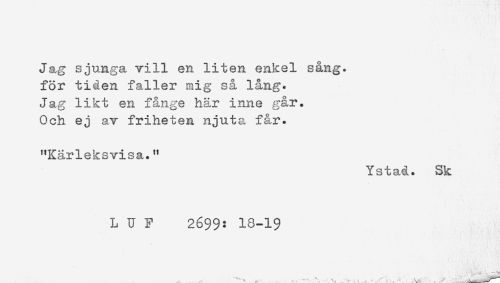 //// Jag sjunga vill en liten enkel sång. //// för tiden faller mig så lång. //// Jag likt en fånge här inne g&r. //// Och ej av friheten njuta får. //// "Kärleksvisa." //// Ystad. Sk //// LUF 2699: 18-19 ////