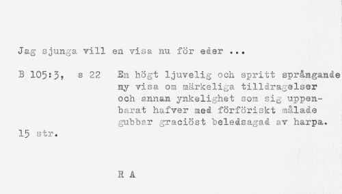 //// Jag sjunga vill en visa nu för eder ... //// B 105:3? s 22 En högt ljuvelig och spritt språngande //// ny visa om märkeliga tilldragelser //// och annan ynkelighet som sig uppen- //// barat hafver med förföriskt m&la&e //// gubbar graciöst beledsagad av harpa. //// 15 str. ////