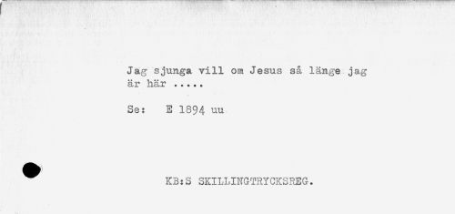 //// Jag sjunga vill om Jesus så länge jag //// + * * * //// c^j!? ilcL-L ***** //// Se: E 1894 //// ^ KB:S SKILUNGTRYCKSREG. ////