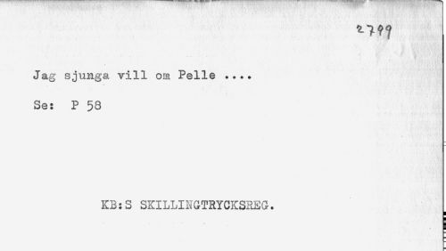 //// Jag sjunga vill om Pelle .... //// Se: P 58 //// KB:S SKILLINGTRYCKSREG. //// ! //// i //// i ////