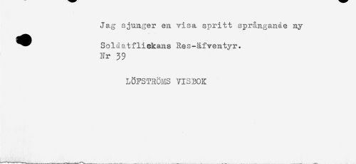 //// Jag sjunger en visa spritt sprängande ny //// ^^^ Soldatfliekans Res-äfventyr. //// Nr 39 //// LÖFSTROMS VISBOK ////
