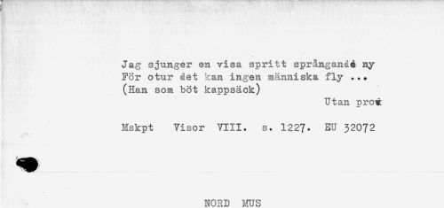 //// Jag sjunger en visa spritt språngandé ny //// För otur ået kan ingen människa fly ... //// (Han som böt kappsäck) //// Utan pron //// Nskpt Visor VIII. s. 1227- EU 32072 //// NORD Ivrns ////