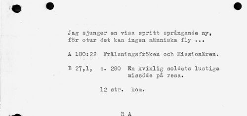 //// Jag sjunger en visa spritt språngande ny, //// för otur det kan ingen människa fly ... //// A 100:22 Frälsningsfröken och Missionären. //// B 27^1? s. 280 En kvinlig soldats lustiga //// missöde på resa. //// 12 str. kom. //// R A ////