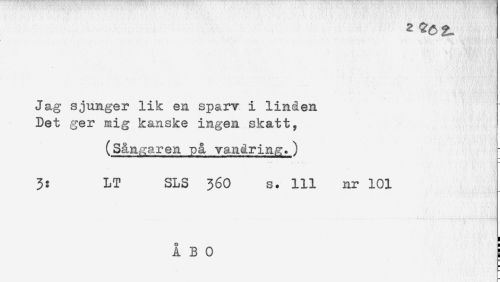 //// Jag sjunger lik en sparv i linden //// Det ger mig kanske ingen skatt, //// (S&n^aren på vandring.) //// 3: LT SLS 36O s. 111 nr 101 //// * //// A B 0 ////