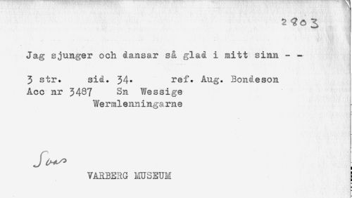 //// Jag sjunger och dansar så glad i mitt sinn - - //// 3 str. sid. 34* ref. Åug. Bondeson //// Acc nr 3437 Sn Wessige //// We r ml e nn inga. me //// VÅRBERG MUSEUM ////