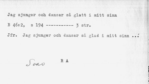 //// Jag sjunger och dansar så glatt i mitt sinn //// B 46:2, s 194 —----3 str. //// Jfr. Jag sjunger och dansar så glad i mitt sinn //// r^ RÅ //// ! //// H ////