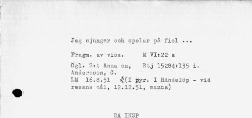 //// ! //// Jag sjunger och spelar p& fiol ... //// Fragm. av visa. M VI:22 a //// Ögl. S:t Anna sn, Rtj 15284:135 i^ //// Andersson, G. //// i LM 16.8.51 ^(1 pyr. I Händelöp - vid //// ^^ resans mal, 12.12.51? manus) //// RA INSP ////