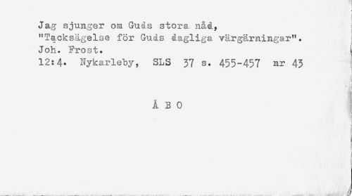 //// r //// Jag sjunger om Guds stora nåd, //// "Tacksägelse för Guds. dagliga värgärningar". //// Joh. Frost. //// 12:4- Nykarleby, SLS 37 s. 455-457 Rr 43 //// * Aa //// ÅBO ] //// ! //// i //// . i ////