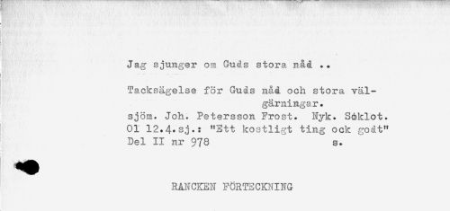 //// Jag sjunger om Guds stora nåd .. //// i - .. . . .......... . .. //// Tacksägelse för Guds n&d och stora väl- //// gärningar. //// sjöm. Joh. Petersson Frost. Nyk. Söklot. //// 01 12.4+sj.: "Ett kostligt ting ock godt" //// Del II nr 978 s. //// ! //// RANCKEN FORTECKNING ////