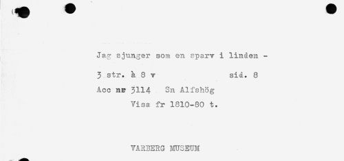 //// Jag sjunger som en sparv i linden - //// 3 str. ä 8 v sid. 8 //// Acc n& 3114 Sn Alfshög //// Visa fr 1810-80 t. //// VARBERG MUSEUM ////