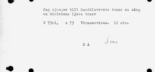 //// Jag sjunger till handklaverets toner en sång //// om kärlekens ljuva toner //// B 79^1? s 73 Värnamovisan. 12 str. //// i. ,.' //// !'.<)%(- * - //// J ^X) //// R A ////