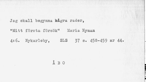 //// Jag skall begynna hågra rader, //// "Mitt första försök" Maria Nyman //// 4:6. Nykarleby, SLS 37 s. 458-459 RT 44^ //// ÅBO , ////