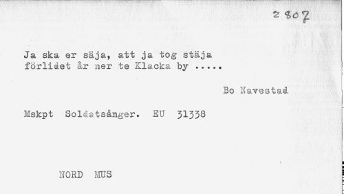 //// Ja ska er säja, att ja tog stäja //// förlidet år ner te Klacka by ..... //// i //// - //// Bo Navestaå t //// Mskpt Solåatsånger. EU 31338 //// : //// NORD 1.IUS ; ////
