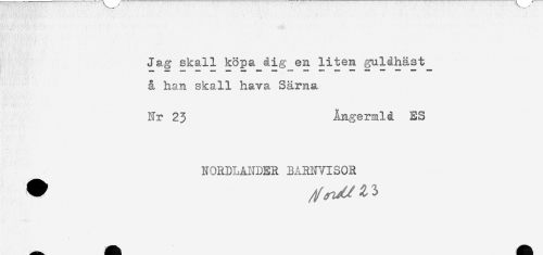 //// Jag skall köpa åig__en liten guldhäst //// å han skall hava Särna //// Nr 23 Ångermlå ES //// NORDLANDER BARNVISOR ////