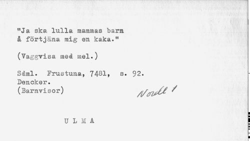 //// "Ja ska lulla mammas barn //// å förtjäna mig en kaka." //// (Vaggvisa med mel.) //// Såml. Frustuna, 7431, s. $2. //// Dencker. //// (Barnvisor) ^ //// U L M A ! ////