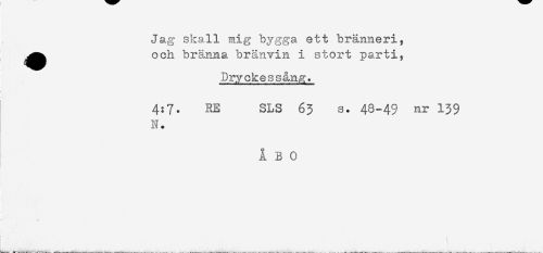 //// Jag skall mig bygga ett bränneri, //// ^^ och bränna bränvin i stort parti, //// Dryckessång. //// 4:7. RE SLS 63 s. 48-49 nr 139 //// N. //// ÅBO ////