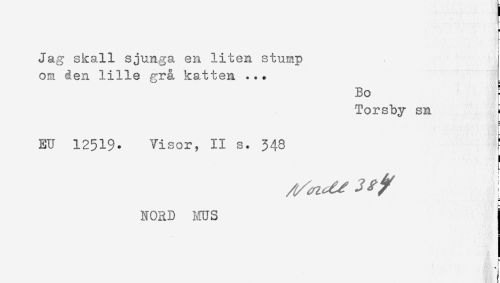 //// r //// }- //// Jag skall sjunga en liten stump //// om den lille grå, katten ... //// Bo //// Torsby sn //// . //// EU 12519. Visor, II s. 348 ? //// ! //// [ //// NORD ms j ////