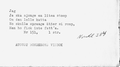 //// Jag //// Ja ska sjonge en liten stomp //// Om den lelle katta //// Ho skulle sprenge ät;ter si rompy 'j //// Men ho fick inte fatt"a. ^ //// * //// AUGUST BONDESONS VISBOK //// ___ _ J ////