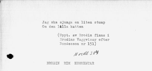 //// Jag ska sjunga en liten stump //// Om den l&lla katten //// (Uppt. av Brodin finns i //// Brodins Vaggvisor efter //// Bonåesson nr l$l) //// BRODIN RIM KOm.IENTÅR ////