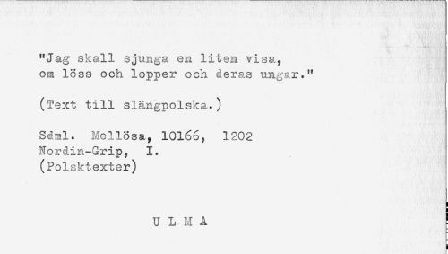 //// "Jag skall sjunga en liten visa, //// om loss och lopper och deras ungar." //// (Text till slängpolska.) //// Sdml. nellösa, 10166, 1202 //// Nordin-Grip, 1. //// (Polsktexter) //// u L n A ! ////