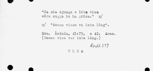 //// - //// "Ja ska sjunga e lita visa //// våra sugga ho ha grisa." x/ //// x/ "denna visan va inte l&ng". //// Såm. Årdala, 41:7% s 42. Årne. //// (Denna visa var inte l&ng.) //// U L M A ////